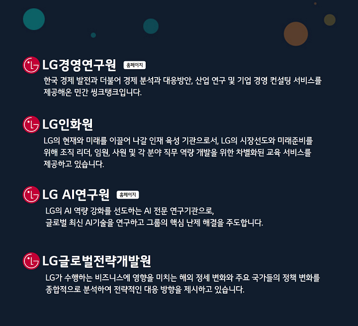 국제 정세를 분석하여 비즈니스의 방향을 제시하는 LG글로벌전략개발원으로 구성되어 있습니다.